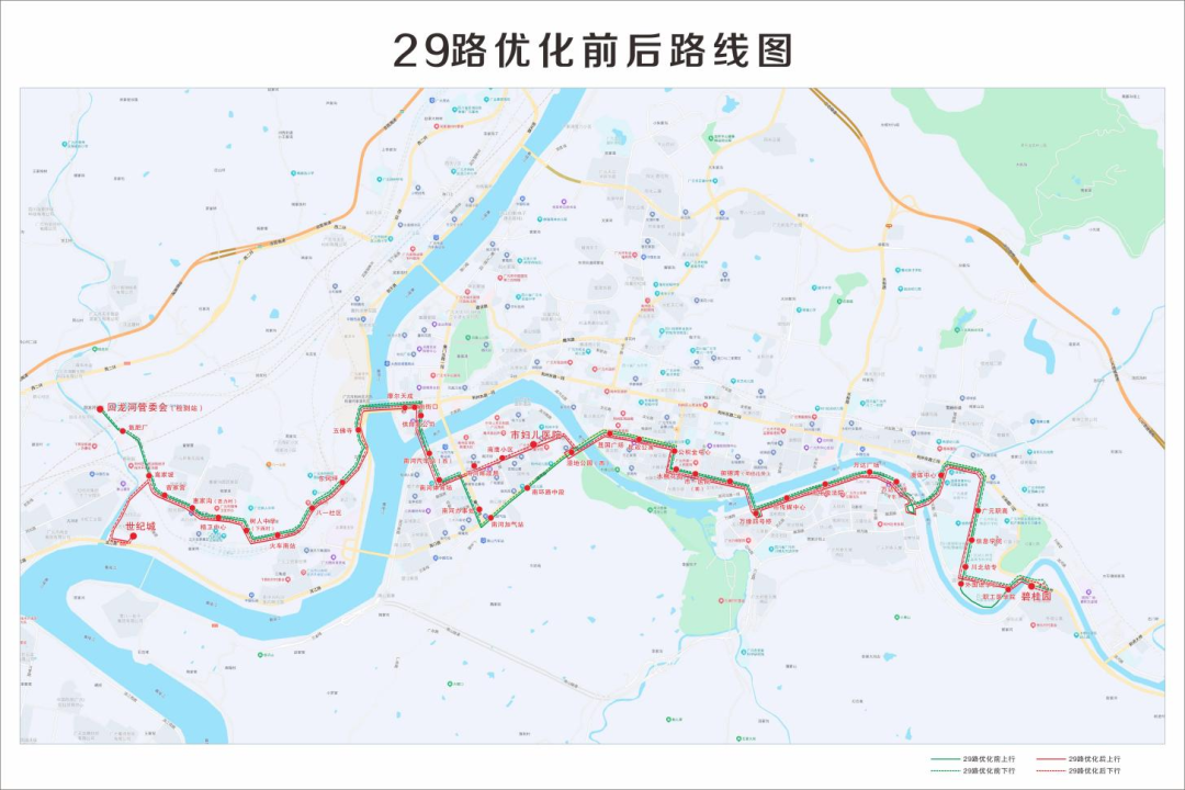 三、調(diào)整29路回龍河管委會(huì)(檢測(cè)站)終點(diǎn)站至世紀(jì)城,并對(duì)南河片區(qū)部分公交站點(diǎn)進(jìn)行優(yōu)化調(diào)整。